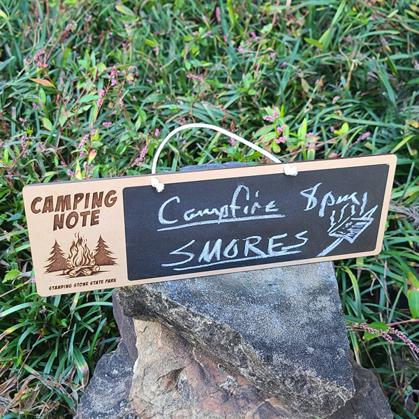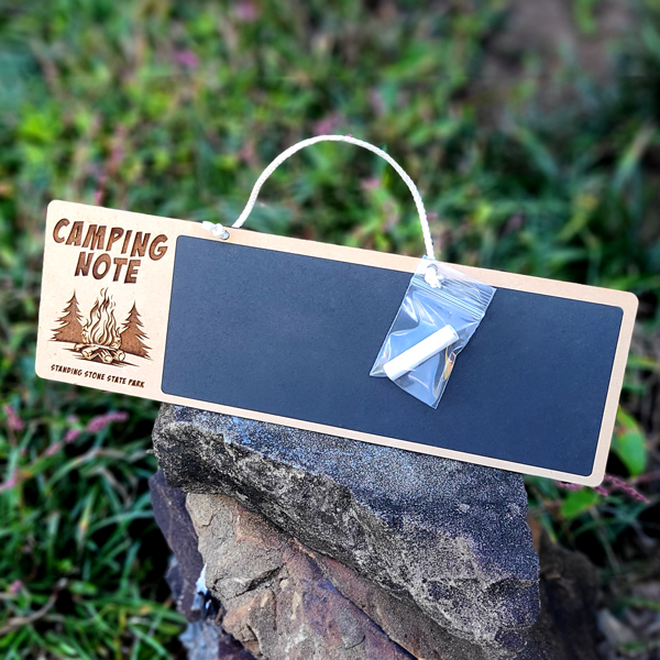 Made of wood with a chalk board section for notes with your park’s name on it.